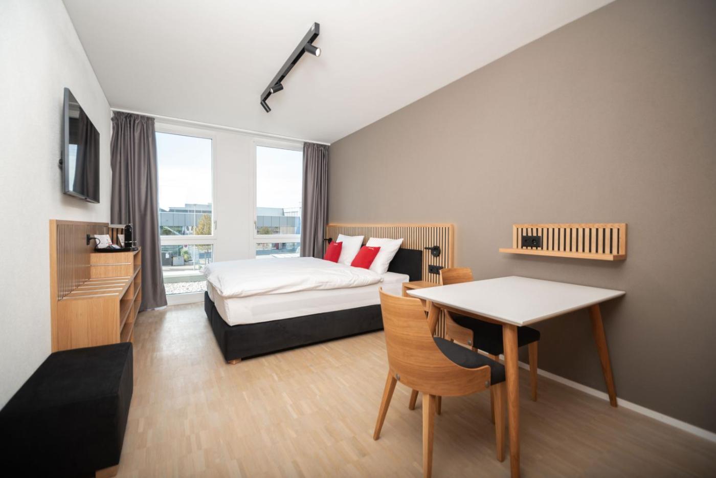 BAB medium Double Room with Kitchenette. The spacious twindouble room offers air conditioning, soundproof walls, as well as a private bathroom featuring a walk-in shower and a hairdryer. The well-fitted kitchenette features a stovetop, a refrigerator, kitchenware and a microwave. The twindouble room has parquet floors, a seating area with a flat-screen TV, a tea and coffee maker, a dining area as well as city views. The unit offers 1 bed. ;